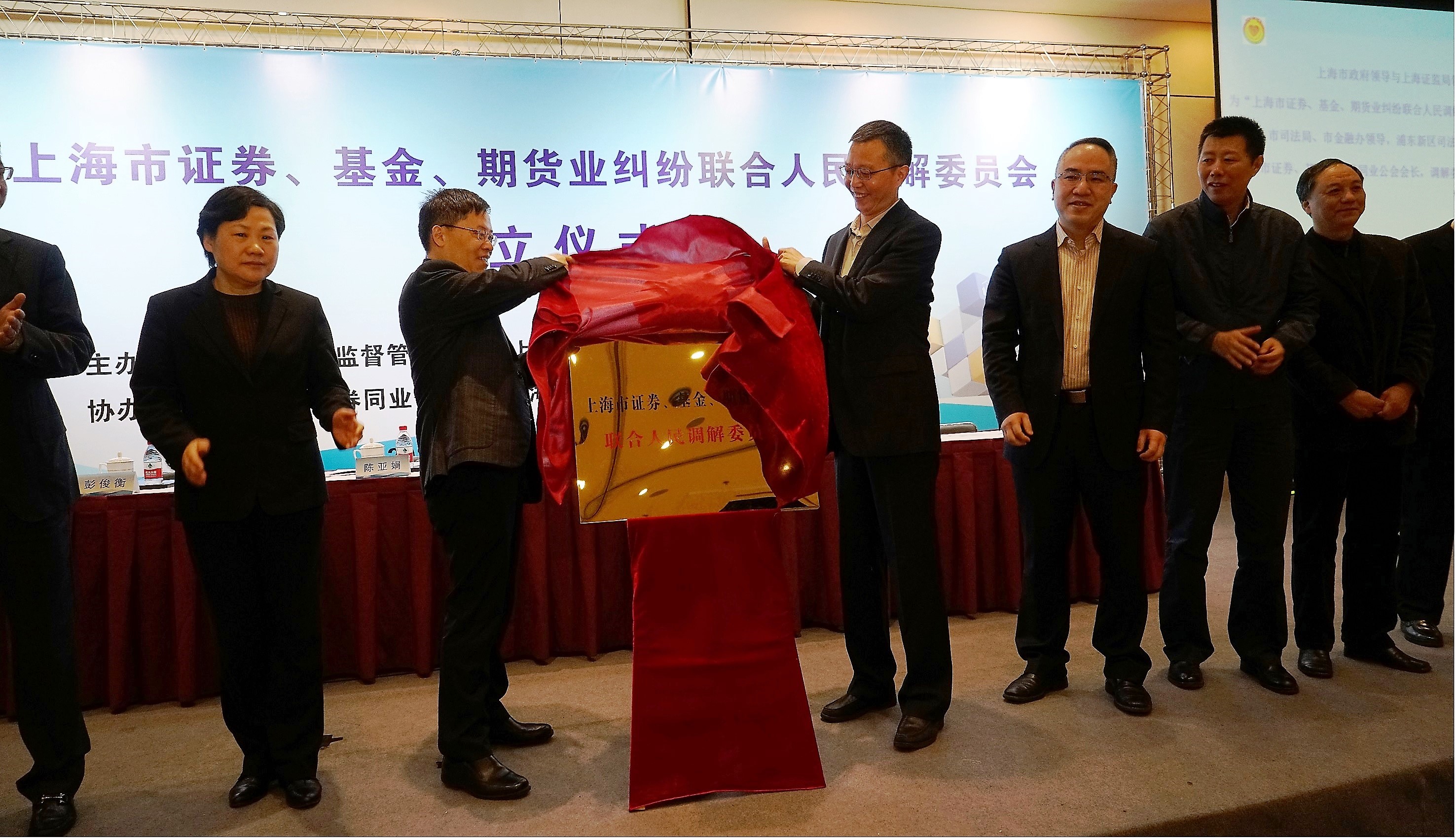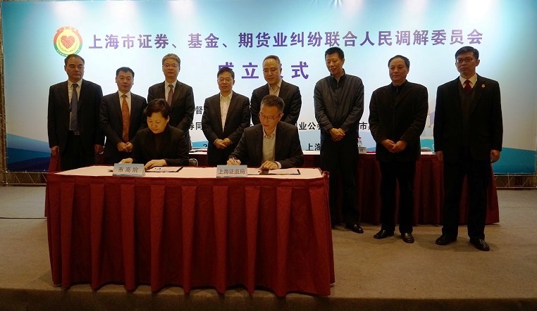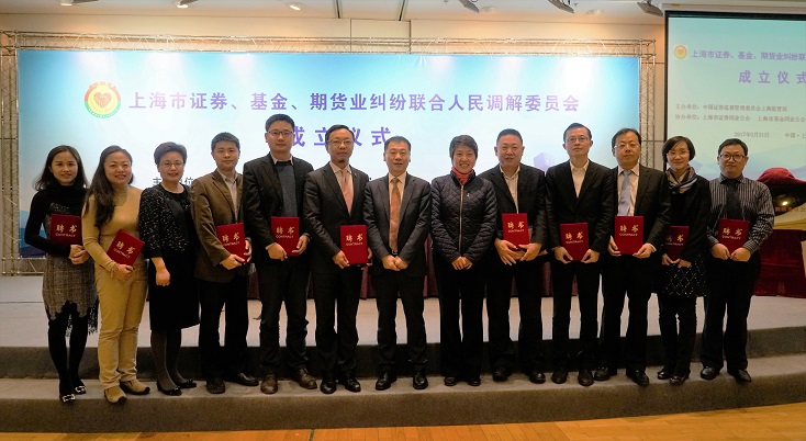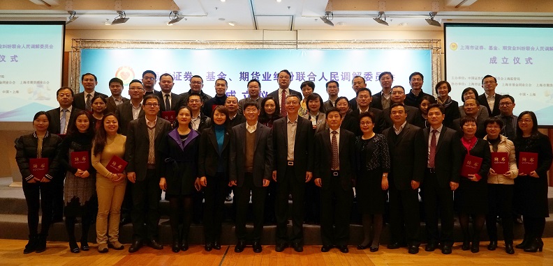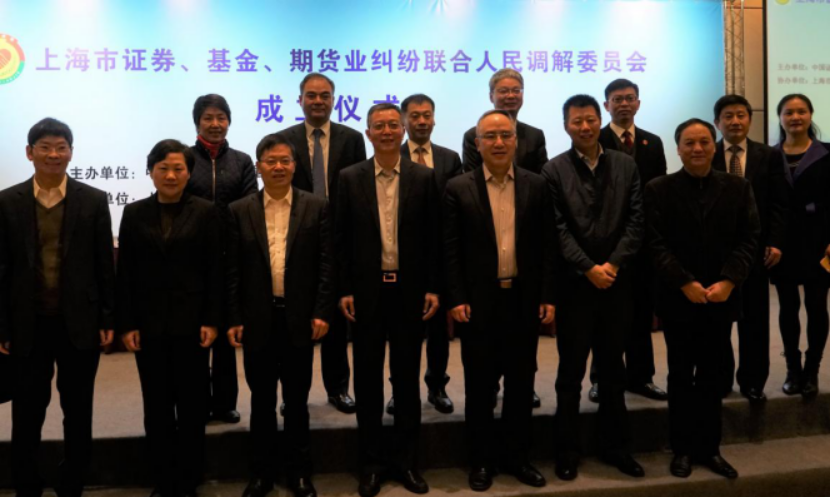 2017年3月31日上午,上海市证券、基金、期货业纠纷联合人民调解委员会成立仪式在上海期货大厦举行。上海市政府金兴明副秘书长、上海证监局严伯进局长、上海市高级人民法院陈亚娟副院长、上海市金融办吴俊副主任出席了仪式。市司法局、浦东新区司法局、浦东新区法院、中证中小投服有限责任公司等相关单位负责人、上海证监局相关处室负责人、市证券、基金、期货三家同业公会负责人、联合调解委员会委员、首批调解员以及市证券、基金、期货业单位代表共计200余人参加了成立仪式。