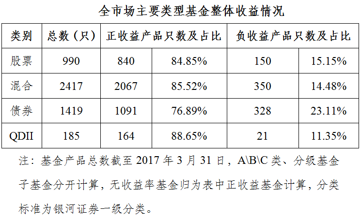 公会对上海基金公司截至2017年3月31日各类型开放式基金的绝对收益排名及整体收益情况进行了观察,3月份主要市场指数震荡调整,上海地区基金公司所管理的各类型基金排名较上月有所变化。公会将上海地区基金公司所管理的产品在相应分类中全国排名前十分别列出,具体排名情况如下: