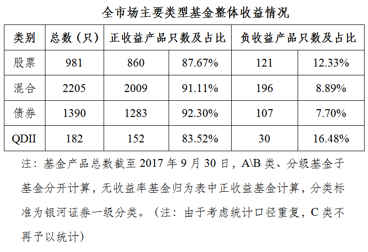 公会对上海基金公司截至2017年9月30日各类型开放式基金的绝对收益排名及整体收益情况进行了观察,9月份主要市场指数维持震荡格局,上海地区基金公司所管理的各类型基金排名较上月有所变化。公会将上海地区基金公司所管理的产品在相应分类中全国排名前十分别列出,具体排名情况如下: