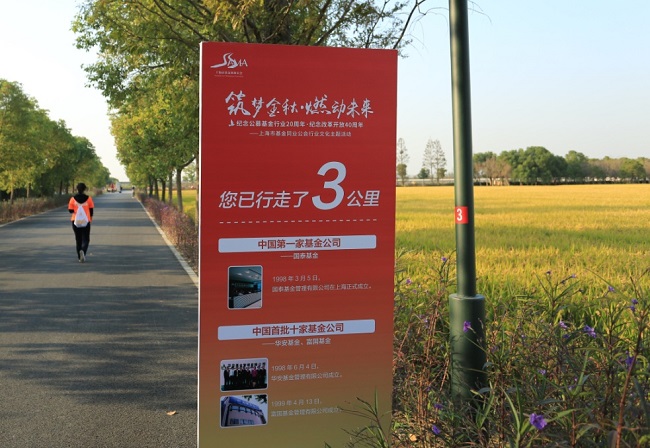 沿途上更有记录着改革开放40周年主题大事记的地贴,让 每一位参与者感受到40年来我国经济的蓬勃发展;中国基金业20周年主题展板,让每一位参与者看到中国基金业重要时刻里上海基金公司的身影 。