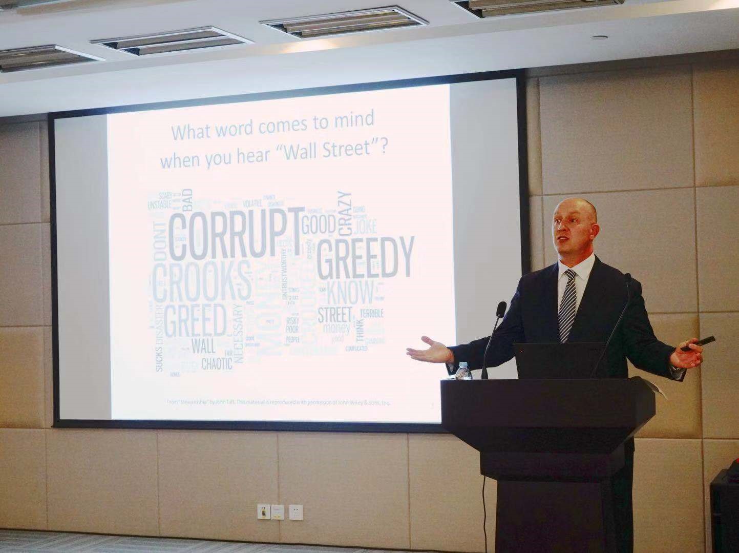 来自美国的Jonathan Boersma先生在金融服务行业已有超过25年的经验,也曾担任全球投资绩效标准(GIPS)的执行董事和CFA协会的专业标准负责人。通过对CFA的调研报告的解读,他认为一个公司的道德文化缺失是导致市场信任缺失的最根本原因,并针对资产管理公司中必要的道德准则进行探讨。接着,Jonathan又从资产管理公司的信息披露和合规性方面诠释了全球投资绩效标准的作用。最后,他指出:投资管理人要以原则为基础,不仅加强的是自身专业素养,同时也是加强投资人信心。