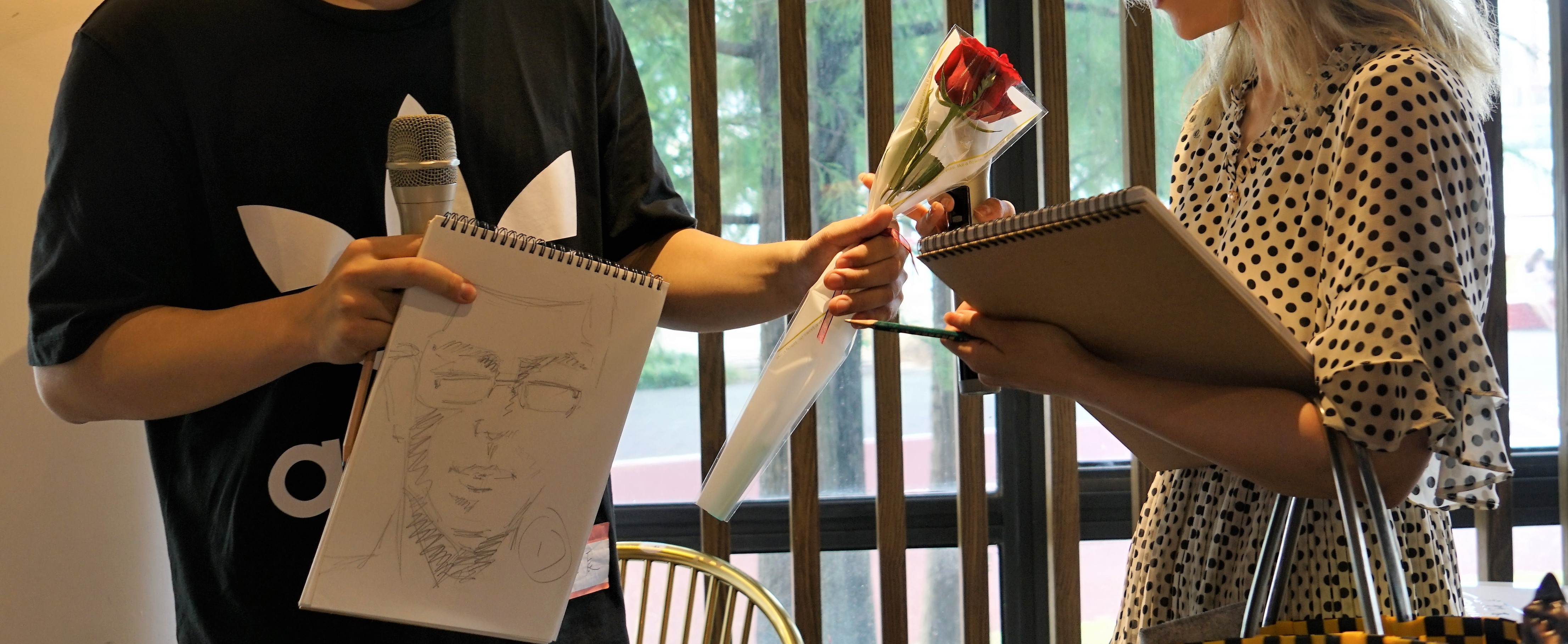 接下来进行的“我的眼里只有你,亿万星辰尤不如”作画环节更是将现场氛围推向了高潮。现场青年自由配对为一男一女的双人组合,通过相互仔细观察,双方在交谈的过程中创作出只属于对方的肖像画,进一步加深了解,也增加了“有美一人,清扬婉兮。邂逅相遇,适我愿兮”的机会。之后的画像介绍环节更是让大家惊喜连连,现场笑声不断、掌声迭起,展现了年轻人的创新思维和青春活力。活动承办方还为青年们准备了浪漫的玫瑰花,将现场氛围烘托得更加甜蜜芬芳。