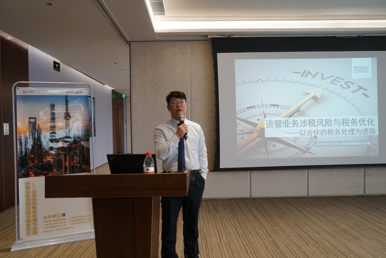 在此背景下,陆家嘴金融城发展局联合上海市基金同业公会等机构于2019年11月29日共同举办了“资管业务涉税风险与税务优化——以合伙的税务处理为进路”专题讲座。特邀北京市金杜律师事务所上海分所税务专家叶永青律师主讲。来自基金、信托、证券资管等机构的逾240位财务相关业务部门人员参加了此次讲座。