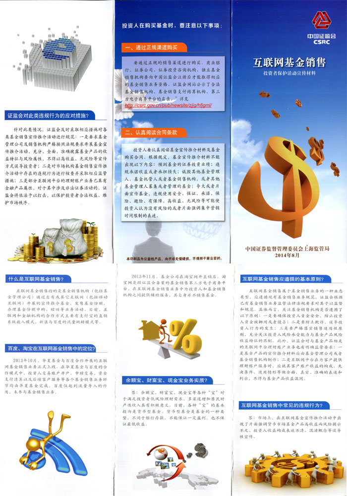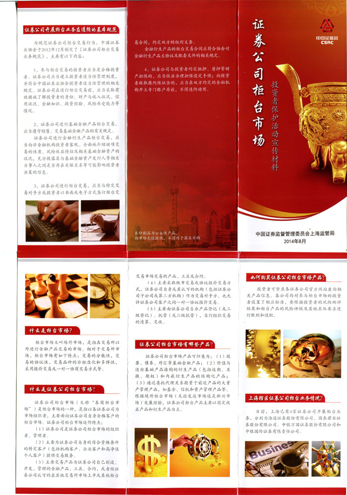 为深入推进投资者保护宣传教育工作,帮助投资者提高风险防范意识,切实保护投资者合法权益,公会即日起向各会员单位发放由上海证监局制作的《互联网基金销售》和《证券公司柜台市场》投资者保护活动宣传材料。