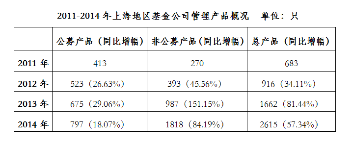 截至2014年底,上海地区45家基金公司管理产品总数为2615只,较2013年新增953只,增幅57.34%。其中,公募基金产品数量797只,同比增加18.07%;非公募产品数量1818只,较2013年新增831,增幅84.20%。