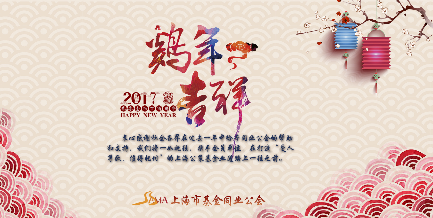 雄鸡唱韵,万户桃符新气象;大地回春,群山霞彩富神州!2017年,我们将在上海证监局的指导下,继续发挥行业自律服务职能,引导行业增强可持续回报能力,推动上海基金业健康持续发展,继续为投资者财富增长而不懈努力,依法维护投资者合法权益,携手全体会员单位共同将上海基金业打造成“受人尊敬,值得托付”的行业。