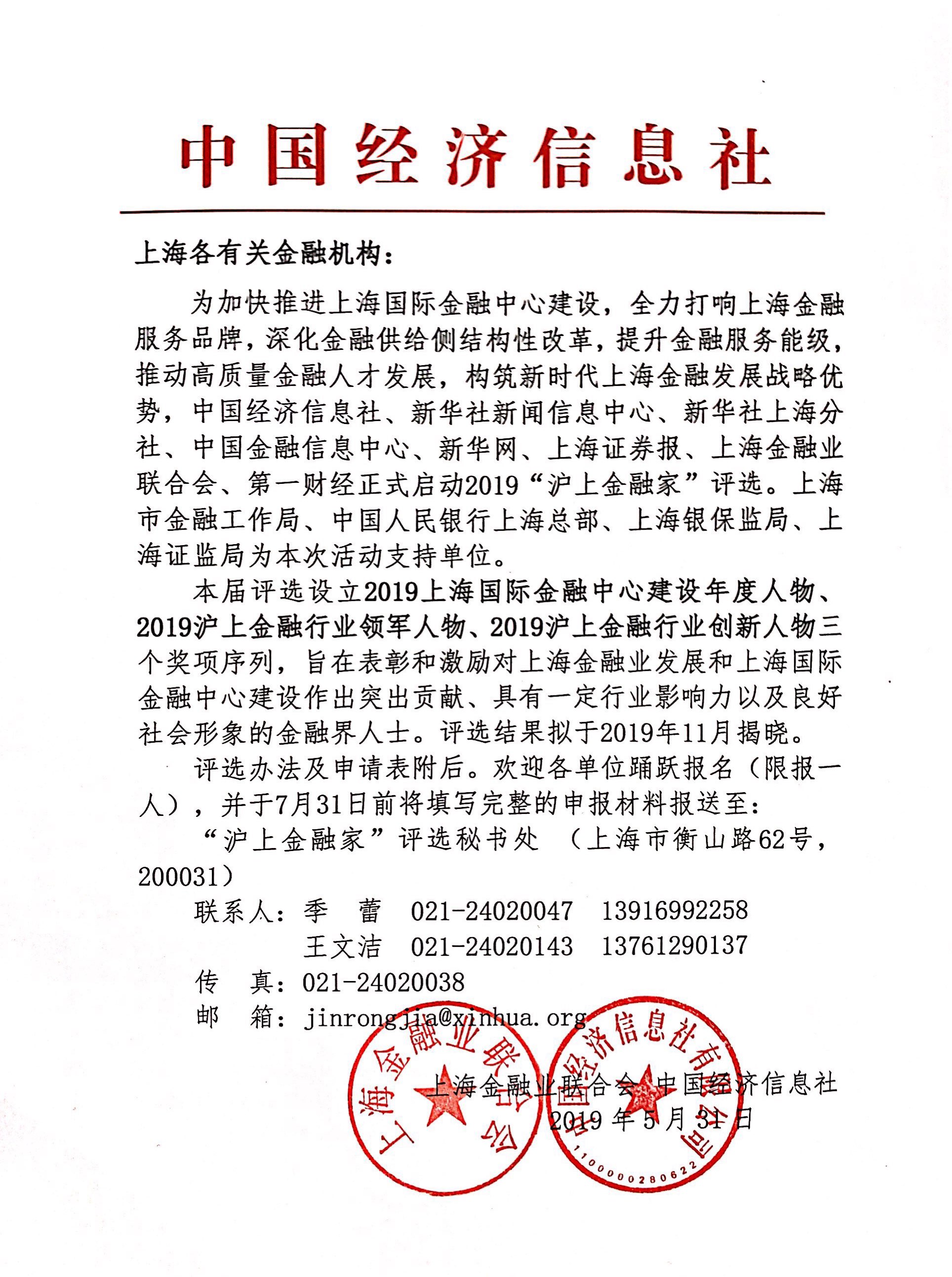 根据上海金融业联合会及新华社中国经济信息社《2019“沪上金融家”评选通知》,2019“沪上金融家”评选工作已正式启动。