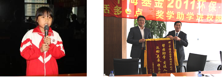2011年10月27日,中海基金“绿色生活多e点,助学奖学进校园”2011环保·助学公益行动正式拉开帷幕。近年来,关注慈善、投身公益日益成为基金行业的共识。中海基金自2008年发起了主题为“十年树木,百年树人”的环保·助学系列活动,通过与上海慈善基金会闵行区分会合作,定向捐助家境困难的农民工子女。截至今年,中海基金已向闵行区民办农民工子女小学弘梅小学捐款三次。更有意义的是,中海基金所捐助的款项,来自于基金持有人取消纸质对账单、使用电子对账单所节省下来纸张的费用。中海基金把节省下来的一小部分费用,为客户搭建一个爱心公益平台,开展“环保·助学”公益活动,其他的部分则以客户的名义用于捐资助学。这在基金行业还是首例。