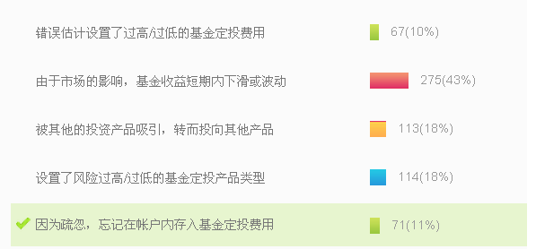 通过转发,共有2216212看到了此次活动,8845的人参与到了活动中来。从投票结果看来,市场波动因素占了很大比重,由此看来,投资人无法坚持定投这种长期投资的主要原因在于市场波动这方面。因此,我们需要引导投资者:市场波动导致的基金收益波动,犹如爱情中出现了感情的波折和考验,此刻,只要有一颗坚守的心,守住的很有可能就是一份完美的爱情,收获的可能就是一份长期投资的回报。