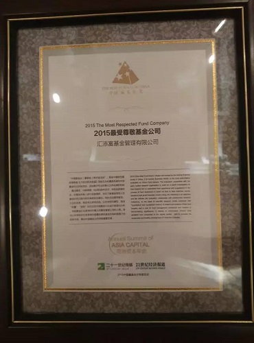 2015年12月11日,在亚洲资本年会之中国“赢基金”奖评选典礼上,汇添富基金公司凭借资产规模、旗下基金业绩、公司治理、投研团队、社会公益等多方面综合实力斩获“2015最受尊敬基金公司”的奖项。