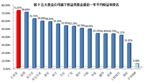 先看最近一年的历史业绩。银河证券基金研究中心数据显示,截止2015年12月末,在过去一年间,汇添富平均股票投资主动管理收益率为71.97%,在前十五大基金公司中排名第一,富国、易方达、华宝兴业、嘉实等紧随其后,同期沪深300涨幅仅为5.58%!