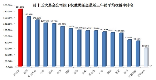 再看过去三年的情况。截止2015年12月末,在过去三年间,汇添富平均股票投资主动管理收益率为184.39%,继续位居前十五大基金公司第一,同期沪深300涨幅为59.05%。