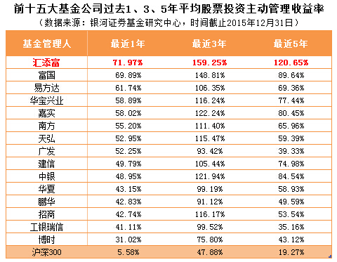 与核心公募资产规模齐飞的正是汇添富基金极具含金量的业绩。根据银河证券基金研究中心统计,截至2015年年末,在过去1年、3年及5年间,汇添富基金旗下权益类基金的平均投资业绩在前十五大基金公司中均位居第一。