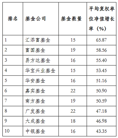 在《2016中国基金业白皮书》中,汇添富旗下15只权益类基金(除指数基金外),2015年以65.87%的平均收益率夺得资产规模超1500亿元基金公司中的第一名。但同样是权益类基金平均收益率,标点财经研究院对Wind资讯的海量数据统计显示,65家进入样本的基金公司里,排名垫底的基金公司权益类基金平均收益率仅7.62%。