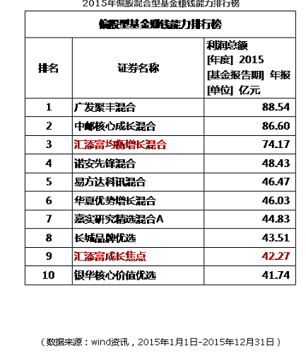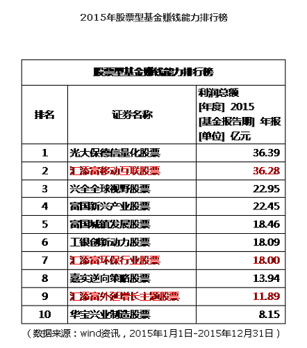 2015年汇添富五只基金跻身权益类基金赚钱榜前十