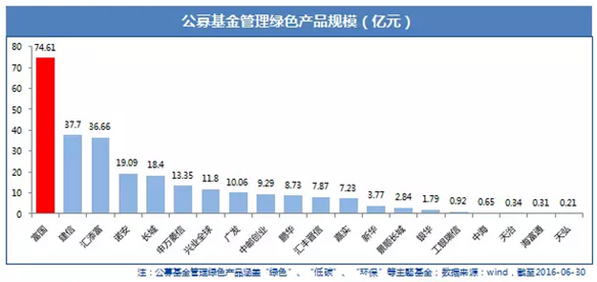 联合中证指数公司努力实现“中证阿拉善生态100指数”产品化的富国基金是市场上最早一批成立的基金管理公司,也是市场上率先开展绿色投资的基金公司之一;截至2016年6月30日,富国基金共管理绿色公募产品74.61亿元,规模占公募基金绿色产品的比例达到27.99%,排名全市场第一。