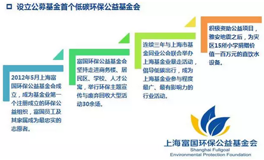 富国环保公益基金会自成立以来,多次走进商务楼、居民区、学校、陆家嘴人才公寓等场所,举行环保主题宣传与废弃回收大型活动30余场;连续三年与上海市基金同业公会联合举办上海基金业暴走活动,倡导低碳出行,成为上海基金业参与程度最广、最有影响力的行业活动;积极资助公益项目,雅安地震后为灾区15所小学捐赠价值一百万元的直饮水设备;积极践行“为生活做减法”的宗旨,每一天,每一点,清洁环境点滴进步......