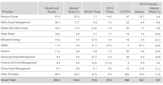 贝莱德最新发布的上述报告显示,2016年底,亚太地区ETP产品共计达到898只,总资产规模增长至2995亿美元,其中,华宝兴业基金管理有限公司与野村集团、道富、三菱集团、汇丰银行、安硕等知名金融机构一起跻身亚太地区前十大ETP发行人行列;华宝兴业基金于2016年末的ETP资产管理规模(未包含LOF基金数据)合计达到89亿美元,占据了亚太地区ETP市场3%的市场份额,华夏基金则紧随其后,二者双双成为中国国内基金公司在亚太区ETP“前十强”中的仅有两名上榜者。