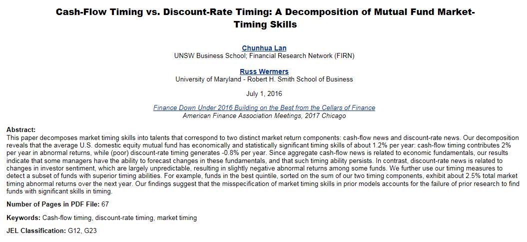 翻译过来,主要内容大致是:文章将市场择时能力分解为利用总现金流信息的能力和利用贴现率信息的能力。分解显示,美国股票型共同基金的择时能力能产生每年1.2%的超额收益,这在经济和统计意义上都是显著的。这一结果表明,一些基金经理有预测经济基本面变化的能力,且这一择时能力具有持续性。