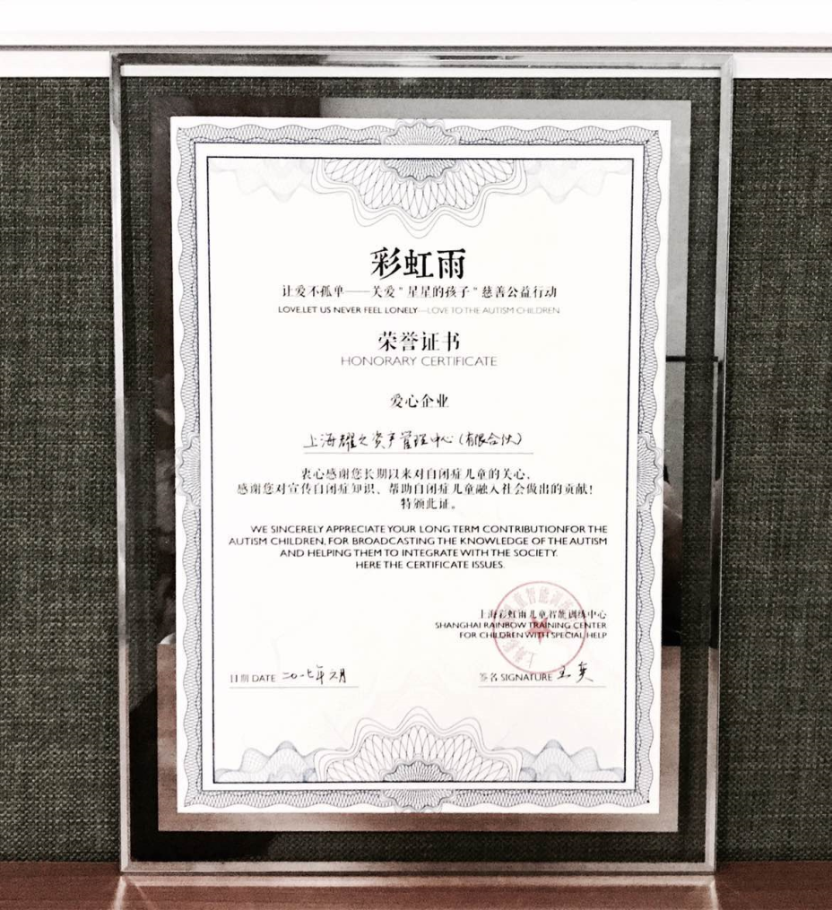 自成立以来,在控好风险做好投资的同时,耀之资产也不忘自身所肩负的社会责任。作为当前社会上权益保障缺失较为严重的群体,自闭症儿童及其家庭亟需得到来自社会方面的关注与爱心。在多年同上海彩虹雨儿童智能训练中心的交流合作中,耀之资产认同其专业规范的运作模式,此次捐赠的善款将供上海彩虹雨为自闭症儿童提供长期身心智能康复训练,逐步减轻患病儿童症状,使其和家人获得相对宽松的生活感受。