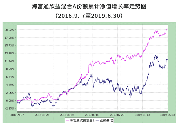 这是一只灵活配置型基金,从投资思路看,它坚持在严格控制下跌风险的基础上,积极把握证券市场的投资机会,追求资产的保值增值。据基金定期报告,自2016年9月以来截至2019年二季度末,海富通欣益混合A在过往11个季度中有9个季度都获得了正收益,仅有2个季度微跌(跌幅不超过0.2%)。