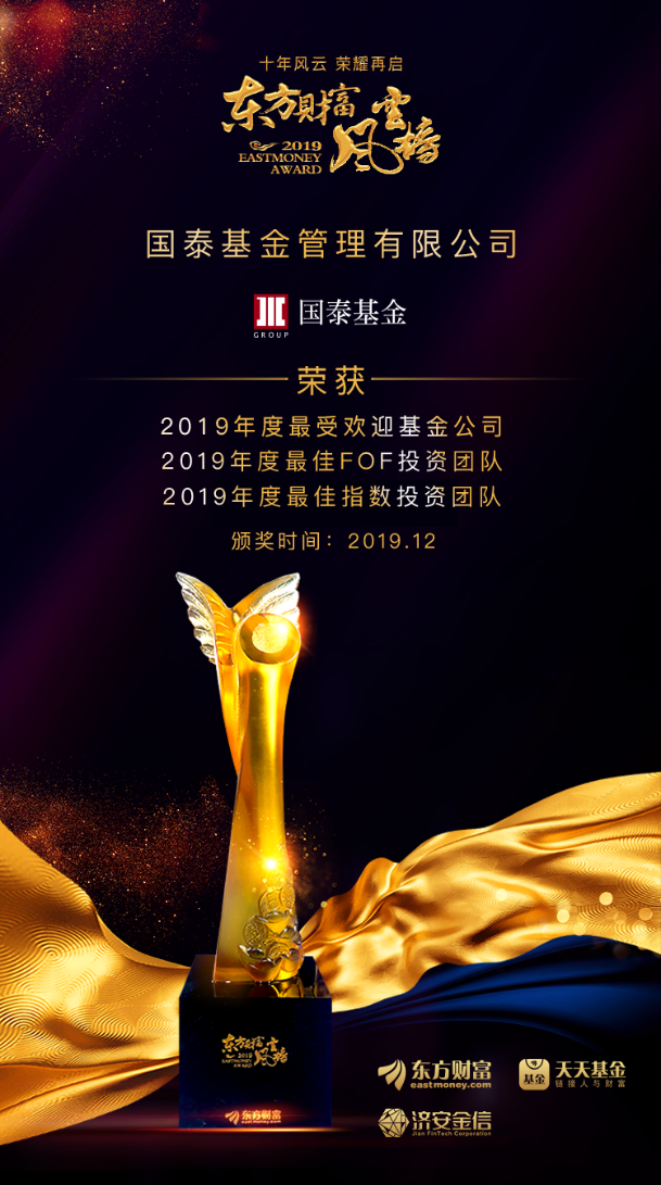 国泰基金在本次风云榜评选中,共斩获“2019年度最受欢迎基金公司”、“2019年度最佳FOF投资团队”、“2019年度最佳指数投资团队”三项大奖,载誉而归。