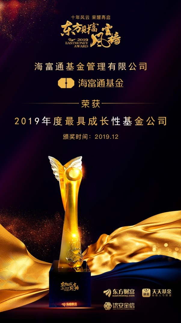 12月21日,国内金融行业最具影响力的年度榜单之一——“2019东方财富风云榜”颁奖典礼在成都隆重举行,海富通基金凭借其产品在2019年度的整体表现、和公司快速成长的品牌新实力,获得了广大网友和专家评审团的认可,荣获“2019年度最具成长性基金公司”奖项。