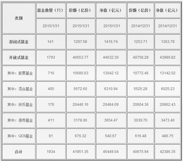 截至2015年1月底,我国境内共有基金管理公司95家,其中合资公司46家,内资公司49家,共有取得公募基金管理资格的证券公司7家;管理的公募基金资产合计45449.04亿元。