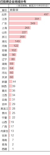根据全国股转系统提供的在审申请挂牌企业基本情况表(截至2015年7月31日),广东省以116家在审企业数量居第一位,其次为江苏省83家、北京市77家、上海市67家、浙江省56家、山东省34家、湖北省31家、四川省31家、河南省28家、河北省17家。