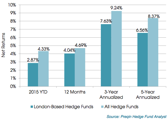 在三年和五年收益率方面,伦敦的对冲基金收益率远低于全球平均水平。