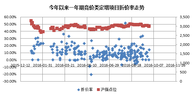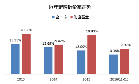 2013年以来,全市场一年期竞价类定增项目折价率呈现递减趋势。今年以来,定增投资出现井喷,前三季度折扣水平逐步降至10%附近,甚至出现21次溢价发行,占比近一成。由于竞争激烈,折扣缩窄的现象在优质标的上尤为明显,精选个股策略的相对有效性下降。