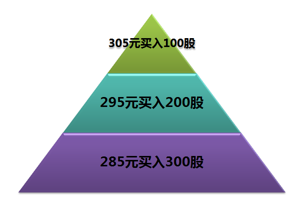 做股票交易的人都知道一招,叫做金字塔建仓法。所谓金字塔建仓法,就是在股价越低的时候买的越多,在股价越高的时候买的越少,从而平均摊薄建仓成本。由于绝大部分人很难买在最低点,所以这个建仓的法则都有意无意地使用过。举个非常简单的例子,小明同学在去年8月的中旬继续看好“贵州茅台”这只股票,他先以每股305元的价格买了100股,没想到建仓建在了底部的左侧,于是当股价跌到295元时再买入了200股,再过了两周,茅台价格依旧不涨,于是他在股价跌到285元时再买入了300股。